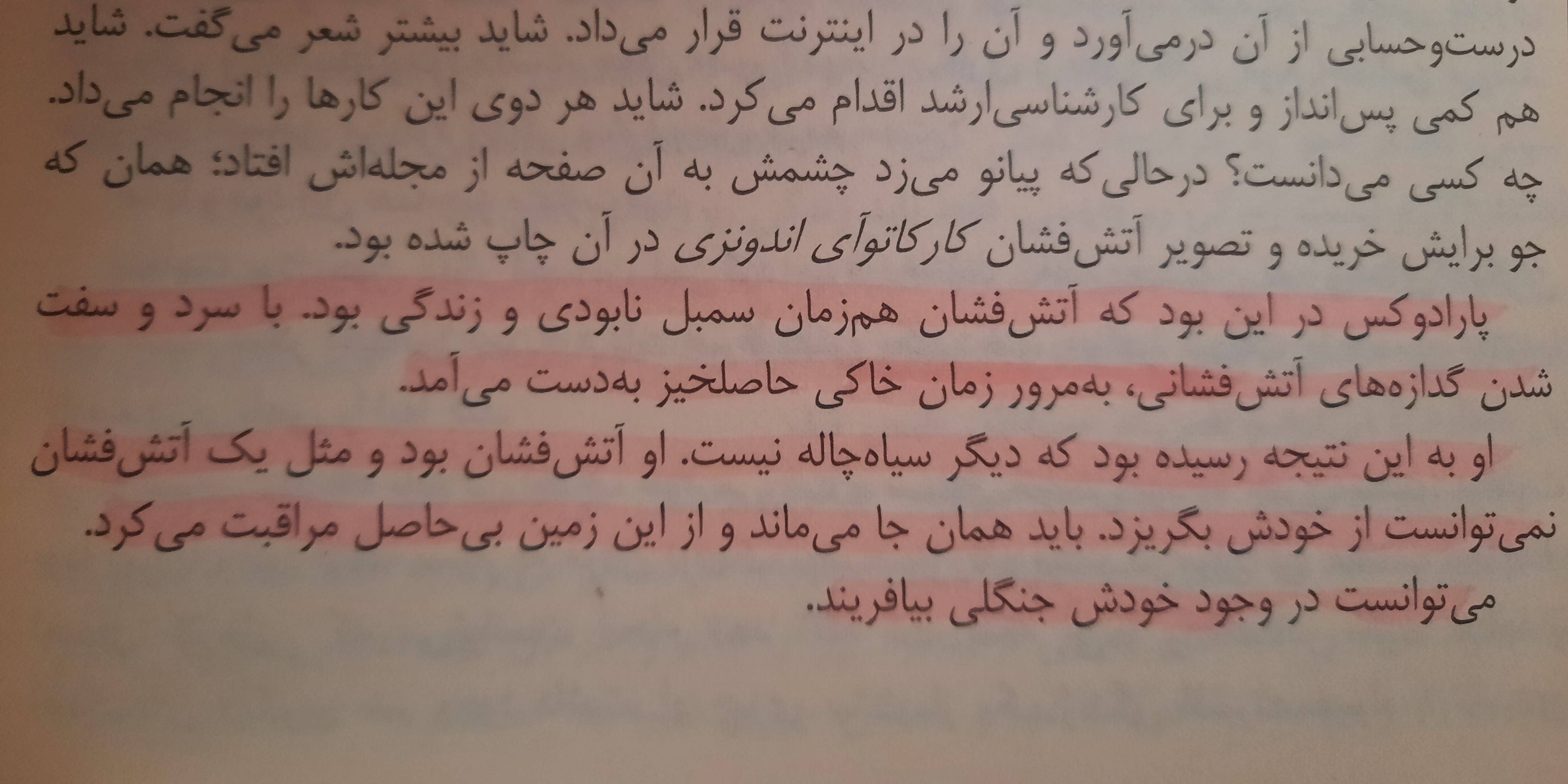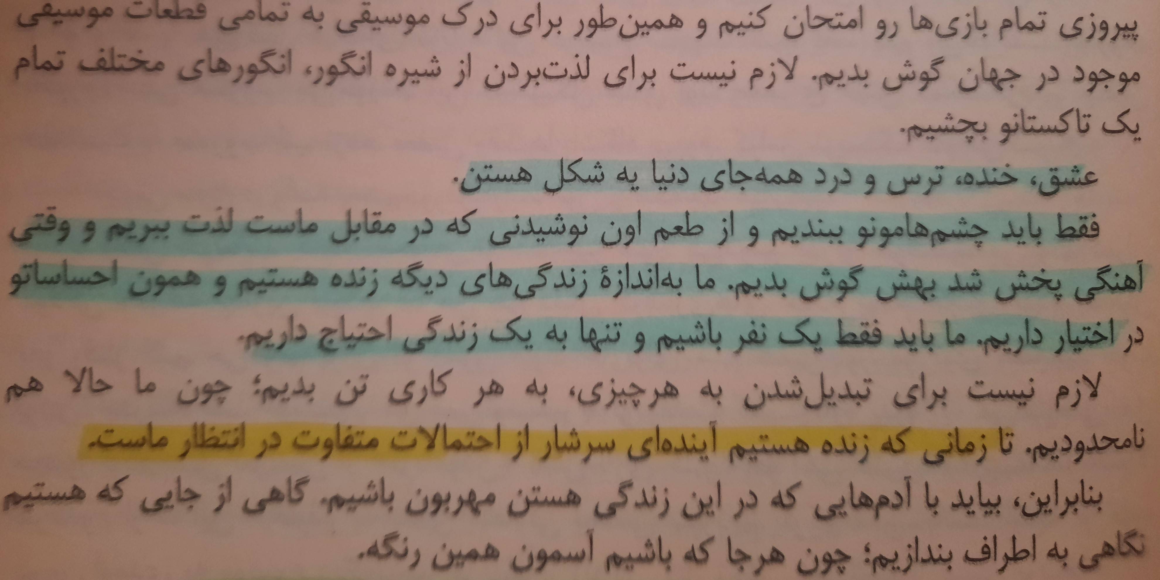 بریدههای کتاب کتابخانه نیمه شب elina 1404/4/22 - 15:19 کتابخانه نیمه شب مت هیگ 4.0 665 صفحۀ 246 نورا دوست داشت در جهانی خالی از هرگونه شرارت و ظلم زندگی کند، اما متاسفانه تمام دنیاهایی که میتوانست انتخاب کند پر از انسان بود. 0 2 مبینا احمدپور 1404/4/24 - 02:55 کتابخانه نیمه شب مت هیگ 4.0 665 صفحۀ 227 ...ولی اگه دنبال معنای زندگی باشی ، هیچ وقت زندگی نخواهی کرد .. 0 1 Arshin Aali Mohammadi 1404/4/26 - 14:57 کتابخانه نیمه شب مت هیگ 4.0 665 صفحۀ 200 اون ها یه مشت جهان نیست، میلیار ها میلیار جهانم نیستن! اونها بی نهایت جهانن بی نهایتی که با هر تصمیمی عوض میشن، فکر کن نورا! 0 2 Fatemeh Amooee 1404/4/26 - 16:29 کتابخانه نیمه شب مت هیگ 4.0 665 صفحۀ 51 ترس از عشق همان ترس از زندگی است و آن کس که از زندگی می ترسد، از قبل مرده است . (ترجمه ابوالفضل بهمن یار انتشارات اردیبهشت ) 0 0 میم صاد 1404/4/27 - 13:52 کتابخانه ی نیمه شب مت هیگ 4.0 665 صفحۀ 21 با گذشت زمان لحظات شاد هم میتوانند به درد تبدیل شوند. 0 6 Reyhane 1404/5/28 - 21:38 کتابخانه نیمه شب مت هیگ 4.0 665 صفحۀ 100 آسمان تاریک می شود سیاهی بر فراز آبی هنور ستاره ها حق دارند برای تو بدرخشند 0 1 زکیه عباسی 1404/4/28 - 16:09 کتابخانه نیمه شب مت هیگ 4.0 665 صفحۀ 403 آسمان تاریک خواهد شد سیاه بر آبی چیره خواهد شد ولی ستارهها هنوز میجنگند و برای تو میدرخشند 0 2 فروید کوچک🌚 1404/4/29 - 16:16 کتابخانه نیمه شب مت هیگ 4.0 665 صفحۀ 185 "ما فقط نیاز داریم یکنفر باشیم و به اندازه یک نفر زندگی کنیم.لازم نیست همه کارها را باهم انجام دهیم تا همه کس باشیم چون ذاتا بینهایت هستیم" 0 1 𝐀𝐫𝐞𝐳𝐨𝐨 𝐟𝐨𝐫𝐨𝐠𝐡𝐢 1404/4/31 - 11:48 کتابخانه نیمه شب مت هیگ 4.0 665 صفحۀ 145 " تنها راه یاد گرفتن ، زندگی کردنه " 0 14 selenophile 1404/5/2 - 14:13 کتابخانه نیمه شب مت هیگ 4.0 665 صفحۀ 125 اگه ما متوجه بشیم هیچ روشی برای زندگی وجود نداره که به ما مصونیت کامل در برابر اندوه بده اون وقت همه چیز خیلی راحت تر میشه. اگه زندگی رو مثل یه پارچه در نظر بگیریم شادی و اندوه تار و پود اون هستن و در هم تنیده شدن 0 0 کلاریس 1404/5/2 - 14:39 کتابخانه نیمه شب مت هیگ 4.0 665 صفحۀ 190 0 7 کلاریس 1404/5/2 - 14:46 کتابخانه نیمه شب مت هیگ 4.0 665 صفحۀ 185 0 46 کلاریس 1404/5/2 - 15:16 کتابخانه نیمه شب مت هیگ 4.0 665 صفحۀ 186 دیروز می دونستم آینده ای ندارم.محال بود مثل الان این زندگی رو بپذیرم؛اما امروز،همین زندگی سرشار از امیده. شاید غیرممکن با "بودن" ممکن می شه. ممکنه زندگی من به طرز معجزه آسایی از درد و ناامیدی و غصه و دل شکستگی و مشقت و تنهایی و افسردگی آزاد بشه؟نه. اما من می خوام زنده بمونم؟بله،بله هزار بار بله. 0 8 میم صاد 1404/5/5 - 19:32 کتابخانه ی نیمه شب مت هیگ 4.0 665 صفحۀ 71 هرگز اهمیت زیادِ چیزهای کوچیک رو دست کم نگیر. باید همیشه این رو به خاطر داشته باشی. 0 2 میم صاد 1404/5/5 - 19:45 کتابخانه ی نیمه شب مت هیگ 4.0 665 صفحۀ 76 اگر قصد دارین چیزی باشین که نیستین، همیشه شکست خواهید خورد. خودتون باشین. سعی کنین، مانند خودتون نگاه، رفتار و فکر کنین. واقعی ترین کپی خودتون باشین. 0 1 میم صاد 1404/5/5 - 20:33 کتابخانه ی نیمه شب مت هیگ 4.0 665 صفحۀ 90 0 0 𝐀𝐫𝐞𝐳𝐨𝐨 𝐟𝐨𝐫𝐨𝐠𝐡𝐢 1404/5/6 - 14:51 کتابخانه نیمه شب مت هیگ 4.0 665 صفحۀ 236 خانم الم" اونی که معمولی ترین چیز دنیا به نظر میرسه ، ممکنه در نهایت همون چیزی باشه که تو رو به موفقیت میرسونه." 0 15 𝐀𝐫𝐞𝐳𝐨𝐨 𝐟𝐨𝐫𝐨𝐠𝐡𝐢 1404/5/6 - 14:57 کتابخانه نیمه شب مت هیگ 4.0 665 صفحۀ 192 آلبر کامو " اما اگه همیشه دنبال معنای زندگی بگردی، هرگز زندگی نمی کنی" 0 28 مبینا احمدپور 1404/5/6 - 19:39 کتابخانه نیمه شب مت هیگ 4.0 665 صفحۀ 326 ...مهم نیست به چی نگاه میکنی ، مهم اینه که چی میبینی !... 0 1 مبینا احمدپور 1404/5/6 - 23:20 کتابخانه نیمه شب مت هیگ 4.0 665 صفحۀ 332 ...احساسِ عجیبِ اتصال با جهان از راه قلب یک انسان دیگر را تجربه کرد ... 0 1